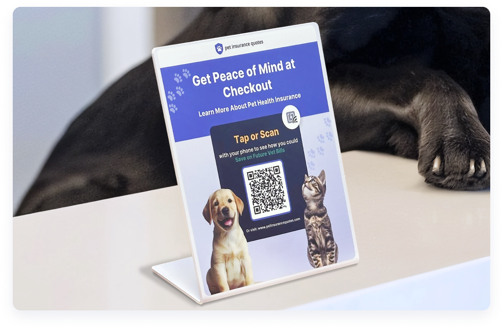 Elevate client education with our QR code displays. With just a scan, pet owners can access essential information about pet insurance and easily compare pet health insurance providers.